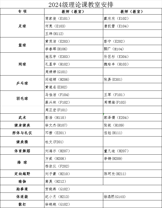 经教务处同意,本学期2024级本科生第3周体育课为乐投中国理论课,9月29日起恢复户外教学。根据教室资源状况,现将理论课具体安排通知如下: